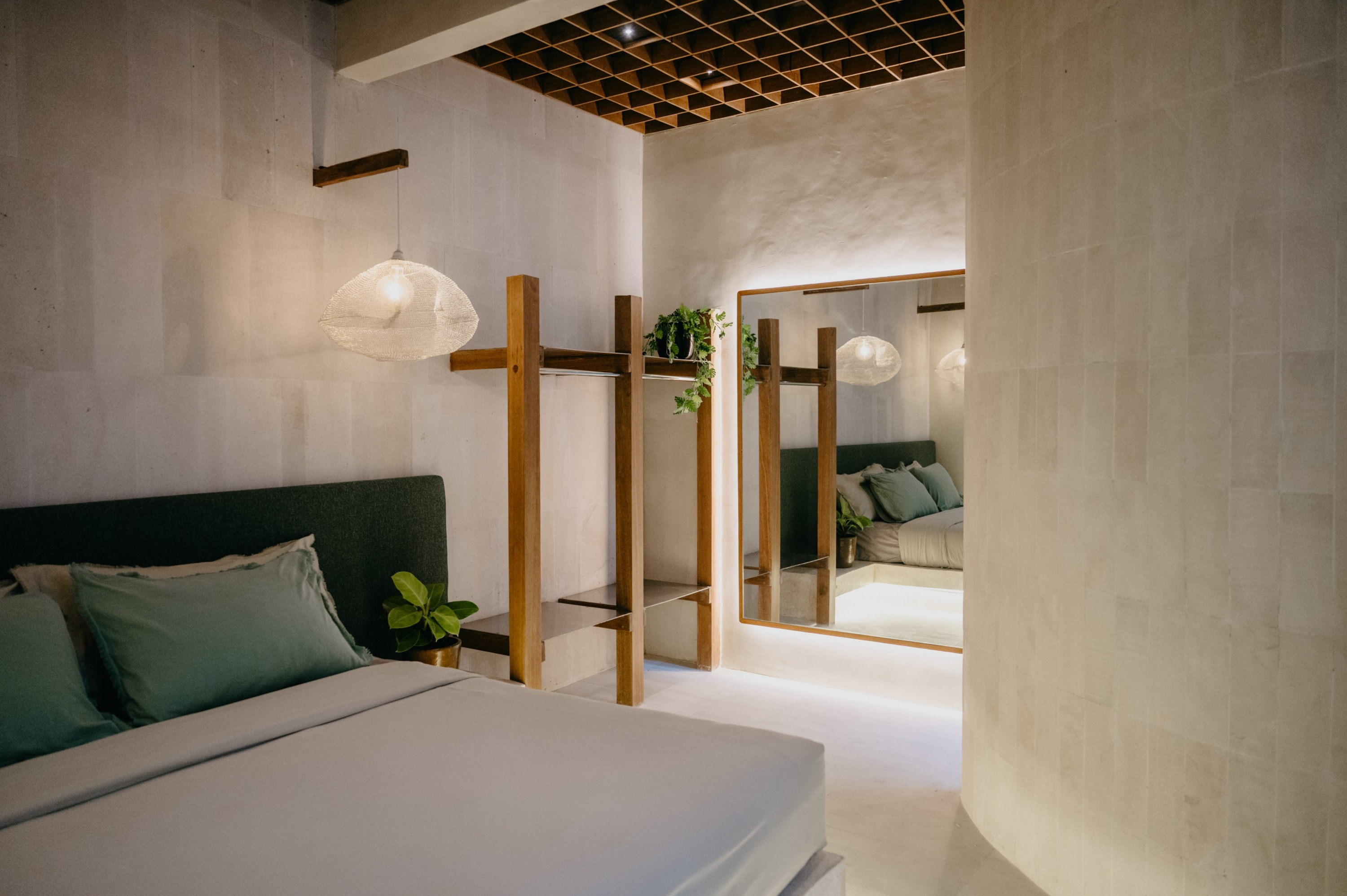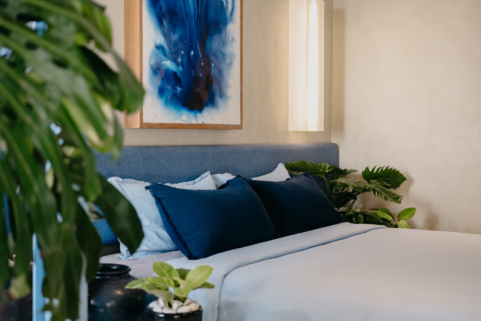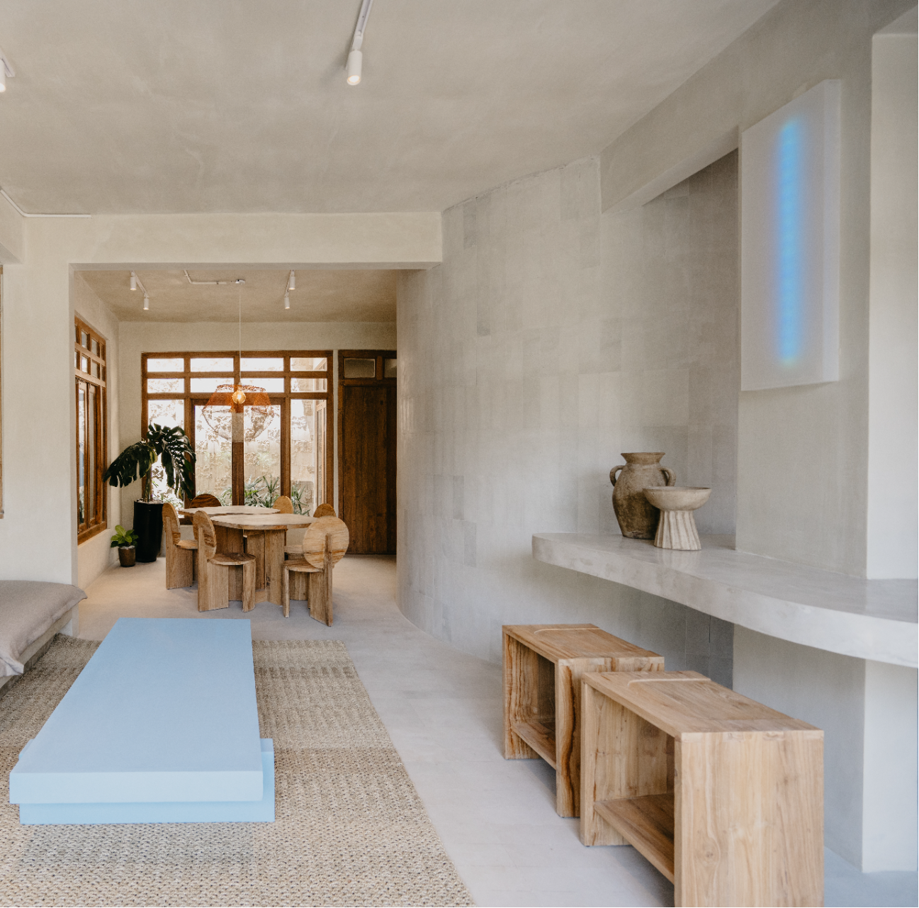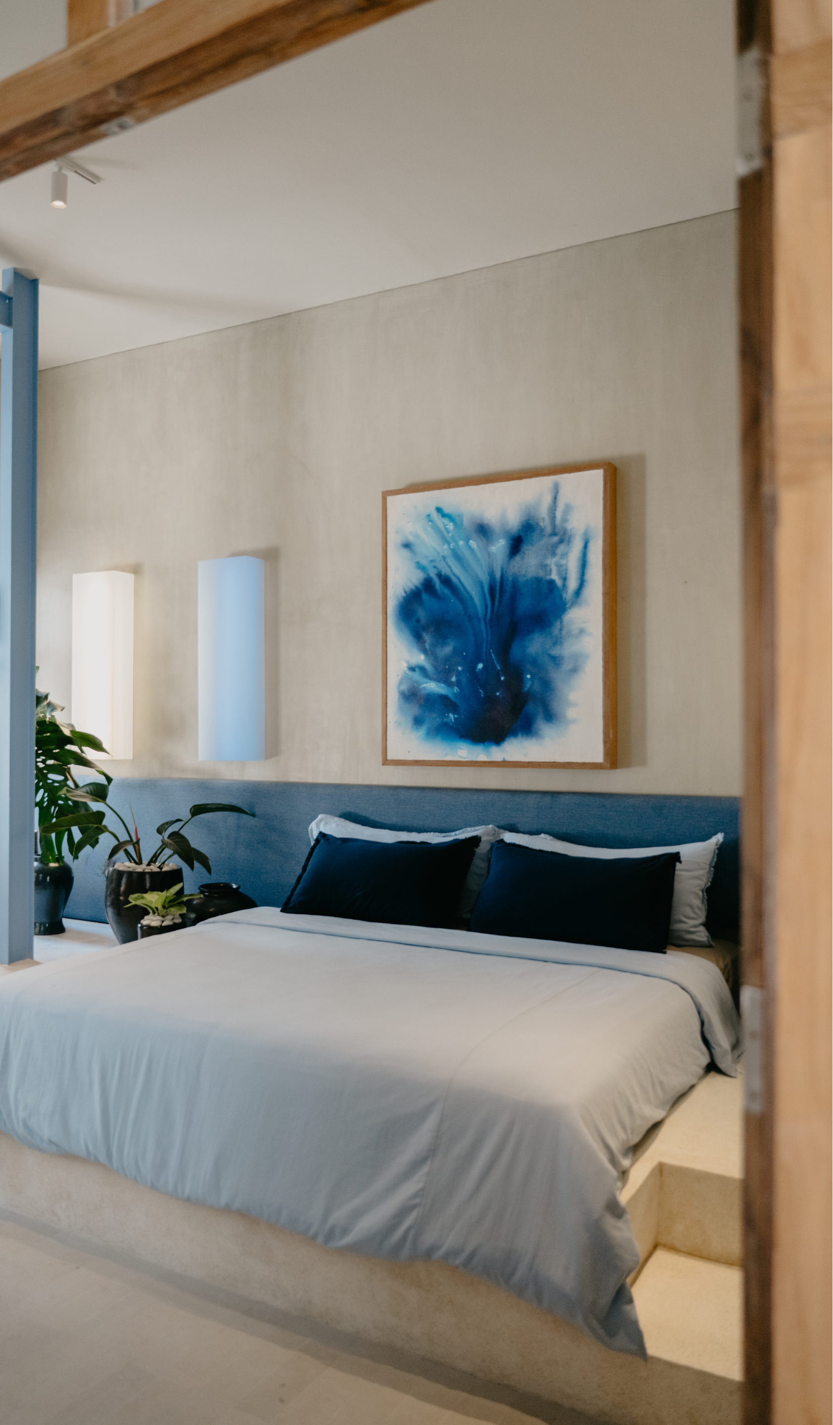 A gentle thread of blue runs through the project: painted details in the bedroom, a pastel coffee table in the living area, subtle accents that cool the palette and guide the eye.