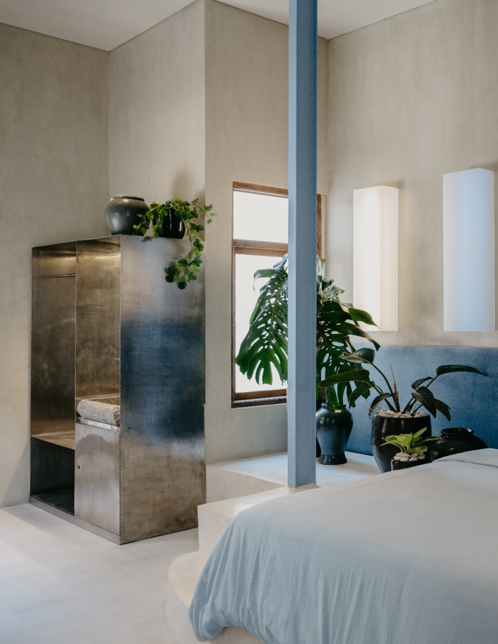 Brushed stainless steel appears throughout the home, not as an industrial statement, but as a sculptural one. Custom joinery, shelving, and contemporary lighting introduce a reflective clarity that balances the organic weight of the timber. The stainless steel pieces were designed to feel quiet, architectural, and intentional — a material that both grounds and elevates.